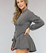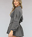 Dieser Playsuit ist aus einem grauen Stoff mit einer leichten Waschung gefertigt. Der Playsuit hat einen hohen Kragen und einen Reißverschluss. Der Strampelanzug ist an der Taille tailliert. Die Ärmel haben Verbindungsbündchen am Ende, wodurch die Ärmel bauschig werden. Die Beine sind kurz und ausgestellt.