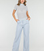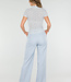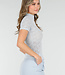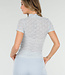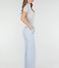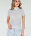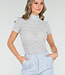 Dieses Oberteil ist aus einem hellblauen, elastischen Häkelstoff mit transparenter Struktur gefertigt. Das Modell hat kurze Ärmel und einen eng anliegenden Rollkragen. Der Stoff ist durchscheinend und dank seiner Stretchqualität sehr bewegungsfreundlich.