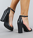 Diese Sandale ist in Lederoptik gehalten. Sie hat einen stabilen Blockabsatz und einen Riemen, der über die Zehen verläuft. Die Ferse der Sandale ist geschlossen und die Sandalette kann mit dem verstellbaren Schnallenverschluss am Knöchelriemen geschlossen werden.
