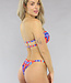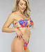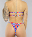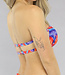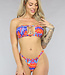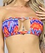 Dieses Bikinioberteil hat einen Bandeau-Stil und verfügt über herausnehmbare Pads. Die Körbchen sind plissiert und haben oben und unten gerüschte Kanten. Es wird von zwei schmalen Trägern mit doppeltem Druckknopfverschluss auf der Rückseite gehalten.