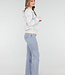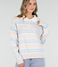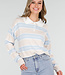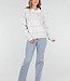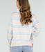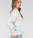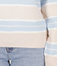 Dieser Pullover ist in Beige mit horizontalen blauen Streifen gehalten. Das Modell ist aus einem Stretch-Strickstoff gefertigt und hat eine gerade, leicht oversized Passform. Der Pullover hat lange Ärmel, einen gerippten Saum und Bündchen. Der Halsausschnitt ist mit einem Kragen und einer kurzen Knopfleiste vorne versehen.