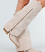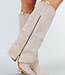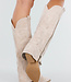 Diese beigen Cowboystiefel aus Wildleder haben einen hohen Schaft mit dezenten Stickmustern. Die Stiefel sind in einem weichen Wildleder-Look gehalten und haben eine spitze Zehenpartie und einen stabilen Blockabsatz. Der typische Westernstil zeigt sich in der V-förmigen Schaftöffnung und den Ziernähten. An der Seite befindet sich ein Reißverschluss, durch den sich die Stiefel leicht an- und ausziehen lassen.