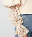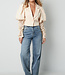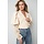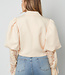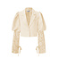 Dieser beigefarbene Kurzblazer ist mit einem einzigen Knopf zu schließen und hat einen tiefen Reverskragen. Die Schultern haben Volumen mit auffälligen Falten, die einen Puff-Effekt erzeugen. Die Ärmel enden in einer kontrastierenden Spitzenpartie im gleichen Beige-Ton. Die Spitzenabschlüsse sind am Handgelenk mit einer Satinschleife verschlossen. Der Blazer ist ungefüttert und hat eine gerade, kurze Passform bis zur Taille.