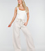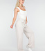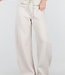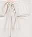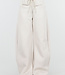 Diese Jogginghose ist in Beige gehalten und hat ein Barrel-Modell mit leicht abgerundeten, weiten Beinen. Der Bund ist mit einem elastischen Band mit Kordelzug versehen. Auf der Vorderseite befinden sich zwei Paspeltaschen. Die Rückseite ist mit einer schrägen Gesäßtasche versehen. Die Hose fällt locker um den Oberschenkel und läuft subtil zum Saum hin aus.