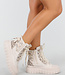 Diese beigen Biker-Boots kombinieren einen robusten Look mit verspielten Details. Die Stiefel verfügen über eine dicke Plateausohle für zusätzlichen Komfort und einen trendigen Look. Die Kombination aus einem Material in Wildlederoptik und dezenten Leoparden-Print-Akzenten an den Seiten verleiht dem Design einen einzigartigen Twist. Dank des seitlichen Reißverschlusses und der Schnürung lassen sie sich leicht an- und ausziehen. Perfekt für einen lässigen oder Streetwear-Look mit edgy Touch.