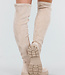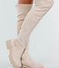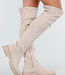 Diese beigen Overknee-Stiefel haben einen hohen Schaft bis über das Knie und sind in einem weichen Wildleder-Look gehalten. Der Stiefel hat eine gerade Passform mit Stretch für einen anliegenden Effekt. Die Sohle ist dick und mit einem groben Profil für zusätzlichen Halt versehen. An der Innenseite befindet sich ein kurzer Reißverschluss zum einfachen An- und Ausziehen.