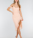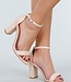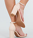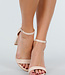 Diese beigen Sandalen haben einen breiten Blockabsatz, der für Stabilität und Komfort beim Gehen sorgt. Der Schuh ist aus glattem Kunstleder gefertigt und hat einen schmalen Riemen über den Zehen und einen verstellbaren Fesselriemen mit Schnalle.