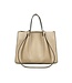Diese beigefarbene Shopper-Tasche ist aus einem geschmeidigen Material in Lederoptik gefertigt und hat eine geräumige, rechteckige Form. Die Tasche verfügt über zwei lange Schulterriemen, die mit goldfarbenen Druckknöpfen sicher befestigt sind. Das Design hat dezente Falten an der Vorderseite, die für eine leichte Struktur im Look sorgen. Die Rückseite ist glatt mit einer vertikalen Naht verarbeitet, während der Boden verstärkt und mit vier goldfarbenen Schutzknöpfen versehen ist. Durch die Kombination aus geraden Linien und weichem Fall wirkt die Tasche sowohl praktisch als auch gepflegt.