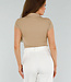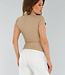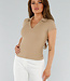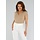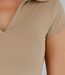 Dieses Polo ist in der Farbe Beige gehalten und hat eine eng anliegende, schmale Passform. Es hat einen klassischen Kragen ohne Knopfverschluss und einen V-Ausschnitt. Die Ärmel sind kurz und liegen eng am Oberarm an. Der Saum ist gerade und fällt knapp über die Hüfte. Die Rückseite ist einfarbig und hat die gleiche Form wie die Vorderseite.