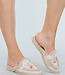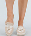 Diese beigen Slipper sind aus einem Material in Wildlederoptik mit einem weichen Teddy-Finish an den Rändern gefertigt. Die Innenseite ist vollständig mit dem gleichen Teddy-Stoff gefüttert, was für zusätzliche Wärme und Tragekomfort sorgt. An der Vorderseite befindet sich ein dekoratives Band mit goldfarbenem Detail. Die Sohle ist flach und leicht, wodurch der Schuh bequem zu tragen ist. Die abgerundete Spitze und das weiche Innenfutter machen diese Slipper ideal für den täglichen Gebrauch an kühleren Tagen.