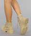Diese Booties sind aus einem matten Stoff in Lederoptik gefertigt und fallen etwa bis zum Knöchel. Sie haben eine klobige Sohle mit einem kleinen Blockabsatz. Auf dem Rist befindet sich ein Schnürverschluss, der durch Ringe geschnürt wird. Sie müssen nur einmal geschnürt werden, da sich an der Innenseite des Fußes ein Reißverschluss befindet. Gut zu kombinieren mit Jeans, aber auch mit einem Kleid oder Rock. Diese Stiefel fallen bis knapp über den Knöchel.