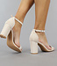 Diese Sandale ist in Wildlederoptik gehalten. Sie hat einen stabilen Blockabsatz und einen Riemen, der über die Zehen verläuft. Die Ferse der Sandale ist geschlossen und die Sandale kann mit dem verstellbaren Schnallenverschluss am Knöchelriemen geschlossen werden.