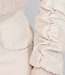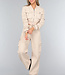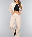 Dieser Zweiteiler besteht aus einem Bomber und einer Hose. Der Bomber hat ein tailliertes Design mit plissierten Details an den Ärmeln, die Ärmelenden haben Verbindungsmanschetten. Auf der Brust hat der Bomber zwei Brusttaschen. Er hat einen runden Kragen und einen Reißverschluss. Die Hose hat einen weiten Beinausschnitt und ist mit einem Knopfverschluss mit Reißverschluss ausgestattet. Außerdem verfügt die Hose über zwei große Seitentaschen und zwei Eingrifftaschen. An der Taille der Hose befinden sich vier Gürtelschlaufen.