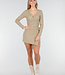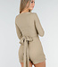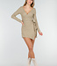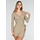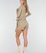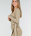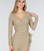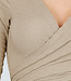 Dieses beige Oberteil ist aus einem weichen, dehnbaren Stoff gefertigt und hat vorne einen Wickelausschnitt. Der V-Ausschnitt ist tief geschnitten und die langen Ärmel liegen eng an. Der Stoff hat eine leicht gerippte Struktur und fällt geschmeidig. Kombinieren Sie es mit dem passenden Skort für ein komplettes Set.