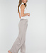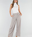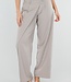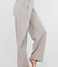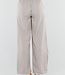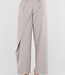 Diese Hose ist in einem Beigeton gehalten und hat eine Barrel-Passform. Das Modell hat eine hohe Taille mit einem Wickeldetail auf der Vorderseite, das mit einem Knopf geschlossen wird. Auf der Vorderseite sind dezente Falten eingearbeitet, die für zusätzliche Weite um die Hüften sorgen. Die Hose läuft leicht ausgestellt aus und verjüngt sich zum Knöchel hin. Der Bund ist elastisch. Der Stoff hat eine glatte Struktur und fällt geschmeidig am Körper entlang.