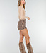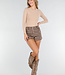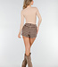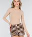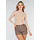 Dieser beigefarbene Body ist aus einem glatten Stretchmaterial gefertigt, das sich eng an den Körper anschmiegt. Das Modell hat lange Ärmel und einen Rundhalsausschnitt. Der Stoff ist elastisch und bietet daher viel Bewegungsfreiheit. Der Body wird unten mit Druckknöpfen geschlossen.