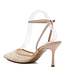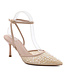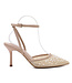 Diese beigen Pumps haben eine spitze Zehenpartie und einen schlanken hohen Absatz. Das Obermaterial ist vollständig mit Perlen, Pailletten und Strasssteinen verziert. Die Pumps haben ein Fesselriemchen mit verstellbarer Schnalle. Das Modell ist an der Ferse offen und vorne geschlossen.