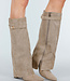 Diese beigen hohen Stiefel in Wildlederoptik haben eine weiche Textur mit einem Riemen und einer Schnalle am oberen Rand. Die Stiefel werden mit einem Reißverschluss an der Innenseite geschlossen und haben eine spitze Zehenpartie. Dank des stabilen Absatzes sind sie bequem zu tragen.