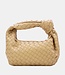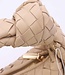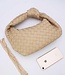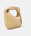 Diese beige Schultertasche ist aus geflochtenem Kunstleder gefertigt und hat eine kompakte, abgerundete Form. Der kurze Henkel ist mit einem auffälligen Knopfdetail versehen, während die Oberseite mit einem goldfarbenen Reißverschluss verschlossen wird. Neben dem kurzen Griff verfügt dieses Modell über einen zusätzlichen abnehmbaren langen goldenen Kettengriff, sodass die Tasche auch als Umhängetasche getragen werden kann. Das geflochtene Muster verleiht der Tasche ein strukturiertes Aussehen, während die geschmeidige Verarbeitung für einen modernen Look sorgt.