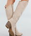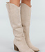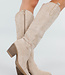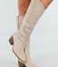 Diese Stiefel sind aus einem beigefarbenen Material in Wildlederoptik mit einer dezenten Struktur gefertigt. Das Modell hat einen halbhohen Schaft bis unterhalb des Knies, einen schrägen Blockabsatz und eine leicht spitze Zehenpartie. An der Innenseite befindet sich ein Reißverschluss zum An- und Ausziehen.