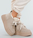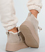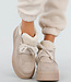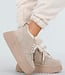 Beige Sneakers im Wildleder-Look, gefüttert mit Kunstfell für zusätzliche Wärme. Das Modell verfügt über eine Schnürung mit Metallösen und einen praktischen seitlichen Reißverschluss. Die dicke Profilsohle sorgt für Stabilität und Halt. Abgerundet wird das Design durch eine runde Zehenkappe und eine Zuglasche an der Ferse.
