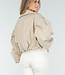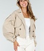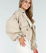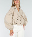 Dieser kurze Trenchcoat in Beige hat eine kurze Länge und ist innen gefüttert. Der Mantel hat einen doppelreihigen Verschluss mit vier Knöpfen auf der Vorderseite und einen klassischen Trenchkragen, Schulterdetails und Brustklappen. Die langen Puffärmel enden in einem elastischen Saum. Die Jacke hat eine gerade, lockere Passform und ist aus einem robusten Stoff gefertigt.