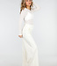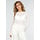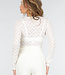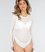 Dieser Body ist aus einem beigen, transparenten Mesh-Stoff mit einem gleichmäßigen Webmuster gefertigt. Das Modell hat lange Ärmel und einen runden Ausschnitt mit schmalem Abschluss. Der Body liegt eng am Körper an und hat eine anschmiegsame Passform. Der untere Teil ist als Body mit glattem Abschluss gefertigt, wodurch das Ganze straff und gleichmäßig sitzt.