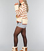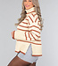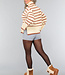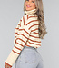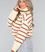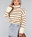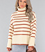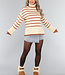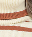 Dieser Rollkragenpullover ist beige mit braunen Streifen und hat ein breites schwarzes Band am unteren Rand. Er hat lange Ärmel und einen großen Rollkragen, den man hochkrempeln kann. Der Pullover ist leicht oversized und hat an beiden Seiten einen kleinen Schlitz.
