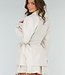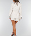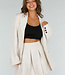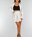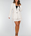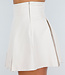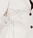 Dieses beigefarbene zweiteilige Set besteht aus einem einreihigen Blazer und einem passenden Skaterrock. Der Blazer hat Schulterpolster und wird vorne mit zwei schwarzen Knöpfen geschlossen, die sich auch an den Ärmeln befinden. An beiden Seiten befindet sich eine korsettartige Schnürung, mit der die Taille verstellt werden kann. Der Rock hat eine hohe Taille, ist in Falten gelegt und hat eine ausgestellte Passform. Ein Blindreißverschluss auf der linken Seite sorgt für einen sauberen Abschluss. Der Stoff ist leicht dehnbar, was für zusätzlichen Tragekomfort sorgt.