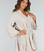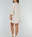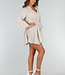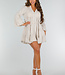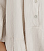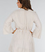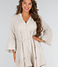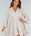 Dieses beigefarbene Kleid ist aus 100% Baumwolle in einer luftigen Musselinstruktur mit Leinenoptik gefertigt. Das Design hat eine locker sitzende A-Linien-Silhouette und fällt asymmetrisch, wobei die Rückseite länger ist als die Vorderseite. Das Kleid hat einen tiefen V-Ausschnitt mit einem schmalen Stehkragen und einem Knopfverschluss auf der Vorderseite. Die langen Ärmel sind weit geschnitten und mit doppelten Rüschen versehen. Der Rock besteht aus zwei weiten Lagen mit Rüschen, die für Volumen sorgen. Das Kleid enthält kein Stretchmaterial.