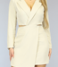 Keywords: beiges Blazerkleid, Vokuhila-Kleid mit Ausschnitt, Überlappung, V-Ausschnitt, lange Ärmel, langärmelig, Schulterpolster, Ziertaschen, asymmetrischer Rock, blinder Reißverschluss, Partywear