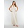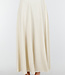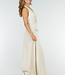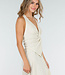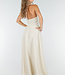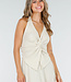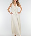 Dieses beigefarbene Set besteht aus einem Neckholder-Top mit tiefem V-Ausschnitt und festem Knopf auf der Vorderseite, kombiniert mit einem langen Rock aus demselben dehnbaren Stoff. Das Oberteil wird am Hals mit Schleifen geschlossen und lässt den Rücken weitgehend offen. Der angeschlossene Rock fällt weit. Der elastische Stoff sorgt für einen festen und bequemen Sitz.