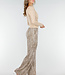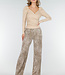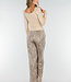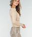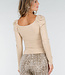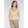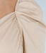 Dieses beigefarbene Oberteil ist aus einem geschmeidigen Stretch-Stoff gefertigt. Es hat einen V-Ausschnitt mit Überlappung und lange Ärmel mit Raffung an den Schultern. An beiden Seiten sorgt ein plissiertes Detail für eine zusammenhängende Passform. Der Stoff ist dehnbar und liegt gut am Körper an.