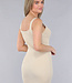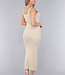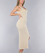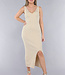 Dieses Kleid ist aus einem weichen Rippstrick-Stretch-Stoff gefertigt. Das Kleid hat breite Schulterträger und einen V-Ausschnitt. Das Kleid hat einen Midi-Schnitt mit einem kleinen Schlitz am unteren Ende, der bis über das Knie reicht.