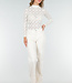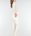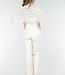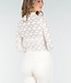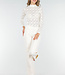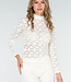 Dieses beigefarbene Oberteil ist aus einem dehnbaren Spitzenstoff mit Blumenmuster. Der Stoff ist transparent. Das Modell hat lange Ärmel und einen schmalen Rollkragen. Das Oberteil fällt gerade am Körper entlang und hat eine leicht enge Passform.