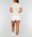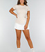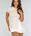 Dieses beigefarbene Oberteil ist aus einem Stretch-Material gefertigt, das sich dem Körper anpasst und für eine eng anliegende Passform sorgt. Das Oberteil hat kurze Ärmel, einen Rundhalsausschnitt und einen Schlitz. Dank des dehnbaren Stoffes bleibt das Oberteil bequem und formstabil. Perfekt für einen lässigen Look oder einen eleganten Anlass.
