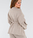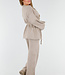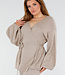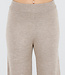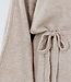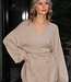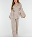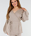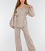 Dieses Set in gemischtem Beige besteht aus einem langärmeligen Wickeloberteil und einer passenden langen Hose. Das Oberteil hat einen tiefen V-Ausschnitt und wird mit einer schmalen Schleife in der Taille geschlossen. Die Ärmel sind weit und fallen bis zum Handgelenk. Die Hose hat gerade, weite Beine. Das fein gestrickte Material hat ein dezentes Mischmuster und ist dehnbar.