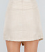 Dieser beigefarbene Minirock hat ein asymmetrisches Überlappungsdesign mit dezenten Falten. Der Rock ist aus einem leicht strukturierten, fein gewebten Stoff gefertigt und hat eine taillierte Passform mit taillierten Coupé-Nähten. Die Taille ist hoch und der Rock wird hinten mit einem verdeckten Reißverschluss geschlossen. Der Saum ist abgerundet und die Länge fällt weit über das Knie.
