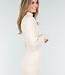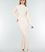 Dieses beigefarbene, lange Strickkleid hat ein gleichmäßiges Rippenmuster. Das Kleid hat einen hohen Ausschnitt, lange Ärmel und Schulterpolster, die die Schulterlinie formen. Der Saum reicht bis zu den Knöcheln und auf der Rückseite befindet sich ein gerader Schlitz am Saum.