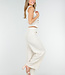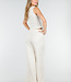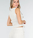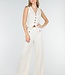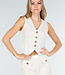 Dieses beigefarbene zweiteilige Set ist aus einem Tweedstoff mit einer dezenten Struktur gefertigt. Das Set besteht aus einer Weste und einer passenden Hose. Die Weste hat einen V-Ausschnitt, einen spitzen Saum und vier goldfarbene Knöpfe auf der Vorderseite. Die Hose hat eine hohe Taille, gerade Beine und dekorative Patten mit Knöpfen. Der Bund enthält Stretch, wodurch die Hose bequem sitzt und ihre Form behält.