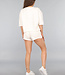 Dieses T-Shirt ist aus einem Baumwoll-Stretch-Stoff gefertigt. Das Shirt hat einen Oversized- und auch Cropped-Schnitt, wodurch es weiter und ein wenig kürzer fällt. Das Shirt hat einen Rundhalsausschnitt und einen gerippten Saum. Dieser gerippte Stoff findet sich auch als zusätzliches Detail an den Seiten wieder. Die Ärmel sind kurz und haben eine ausgefranste Optik, ebenso wie der untere Teil des Shirts. Das Shirt ist Teil eines Sets und wird separat verkauft.
