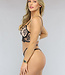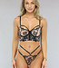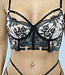 Alle Teile sind aus Mesh und daher durchsichtig, außerdem sind sie mit Blumen bestickt. Der BH hat Bügel und auf der Rückseite einen Hakenverschluss, der aus zwei Haken besteht, die man in drei Positionen einstellen kann. Wird mit passendem String geliefert.