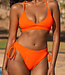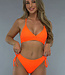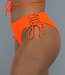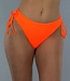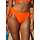 Dieses Bikini-Unterteil hat eine hohe Taille und ist aus einem gerippten Stoff gefertigt. Es ist leuchtend orange und hat eine Schleife an den Seiten, die man nach Belieben verstellen und binden kann. Die Shorts fallen schön über das Gesäß und bedecken alles gut.