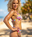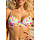 Dieses Bikinioberteil hat einen bunten Blumenprint und ist aus einem glatten Stoff gefertigt. Das Oberteil hat ein Dreieck-Design mit herausnehmbaren Polstern. Die Träger verlaufen über die Schulter und sind ebenfalls verstellbar. Das Oberteil kann mit einer Schleife auf dem Rücken geschlossen werden.