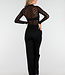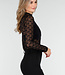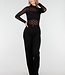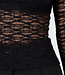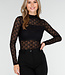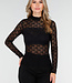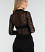 Dieses schwarze Oberteil ist aus einem halbtransparenten Stoff mit auffälligem Spitzenmuster gefertigt. Das Oberteil hat lange Ärmel und eine enganliegende Passform. Der Rollkragen sorgt für einen geschlossenen Ausschnitt und einen eleganten Abschluss. Sowohl die Vorder- als auch die Rückseite sind transparent und mit einem horizontalen, blickdichten Band um die Brustpartie versehen. Der Stoff ist dehnbar und fein gewebt.
