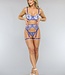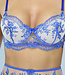 Alle Teile sind aus Mesh gefertigt und schimmern daher durch, außerdem sind sie mit Blumen bestickt. Der BH hat Bügel und auf der Rückseite einen Hakenverschluss, der aus zwei Haken besteht, die man in drei Positionen einstellen kann. Die Schulterträger sind fest, aber verstellbar. Der Strapsgürtel hat verstellbare/nicht abnehmbare Strapse und den gleichen Hakenverschluss wie beim Oberteil. Wird mit passendem String geliefert.