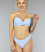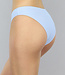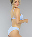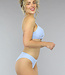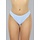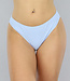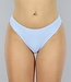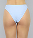 Dieses Bikini-Unterteil ist hellblau und weiß und mit Streifen versehen. Dieses Bikinihöschen-Modell sitzt hoch auf den Hüften und lässt die Beine länger und die Taille schmaler erscheinen. Außerdem bedeckt das Bikinihöschen den Rücken gut, während es an den Seiten noch ein wenig Haut zeigt.