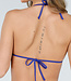 Dieses Bikini-Oberteil ist ein Triangel-Modell mit einer gehäkelten Struktur. Der gehäkelte Teil hat ein weißes Muster mit einer blauen Unterlage. Das Oberteil hat Neckholder-Träger, die im Nacken gebunden werden, und einen Riemen, der am Rücken geknotet wird. Zwischen den Cups befindet sich ein kleines Verbindungsdetail aus Metall.
