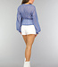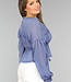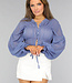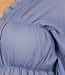 Diese blaue Bluse ist aus einem durchscheinenden Stoff gefertigt. Sie hat lange Puffärmel und mehrere Falten und Rüschen. Die Bluse hat drei Knöpfe, die auch einen V-Ausschnitt bilden.