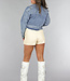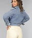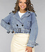 Diese Jeansjacke ist kurz geschnitten. Sie hat einen umgeschlagenen Kragen und lange Ärmel, ist mit einem Knopfverschluss versehen und hat zwei Taschen. Am unteren Ende der Jacke befindet sich ein Gürtel mit Schnalle. An den Schultern und an den Handgelenken ist die Jacke mit Epauletten versehen.